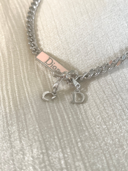 Dior稀有銀色粉紅色蝴蝶結CD吊飾鎖骨鏈頸鏈 日本中古Vintage