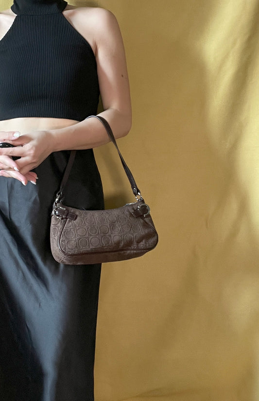 Ferragamo絕版啡色皮革肩帶馬蹄扣絨布腋下包
