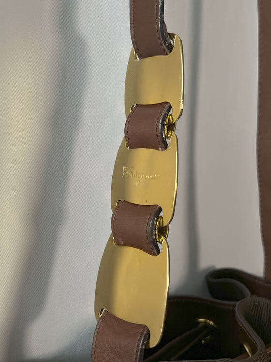 Ferragamo啡色水桶包 稀有金色金屬牌肩帶 側背斜揹肩背袋